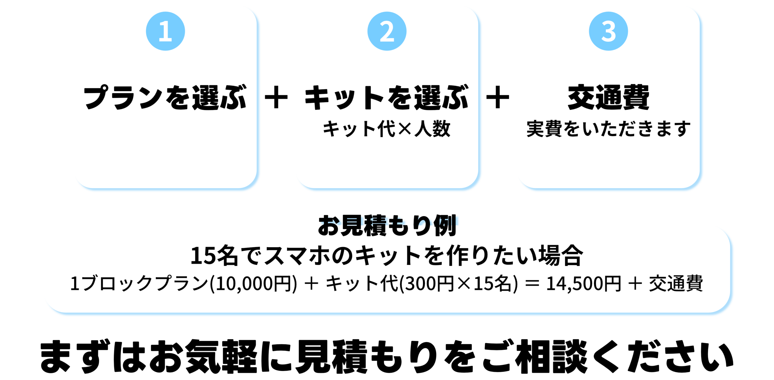 時間配分・キット内容・準備物を整理し、概算費用をお伝えします。