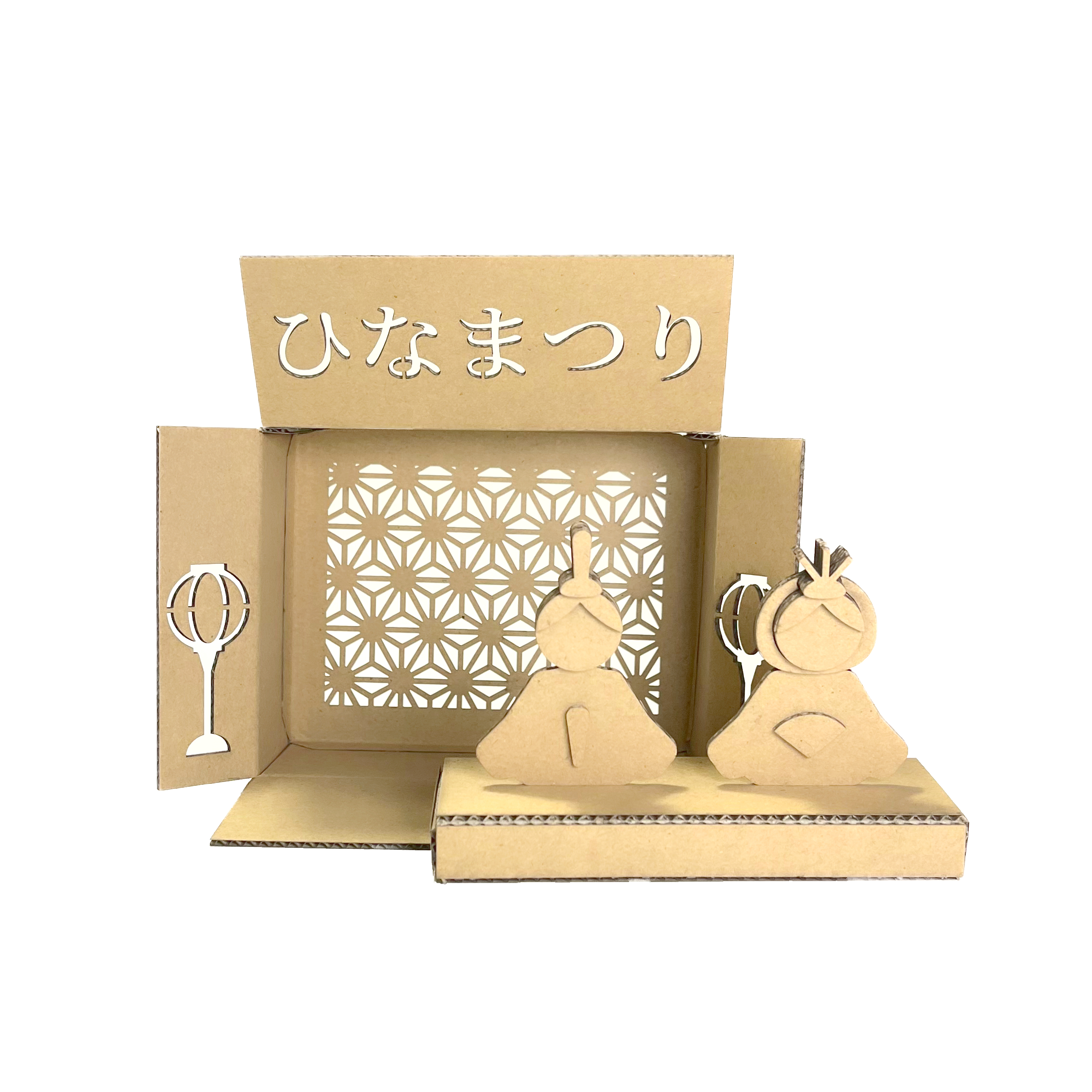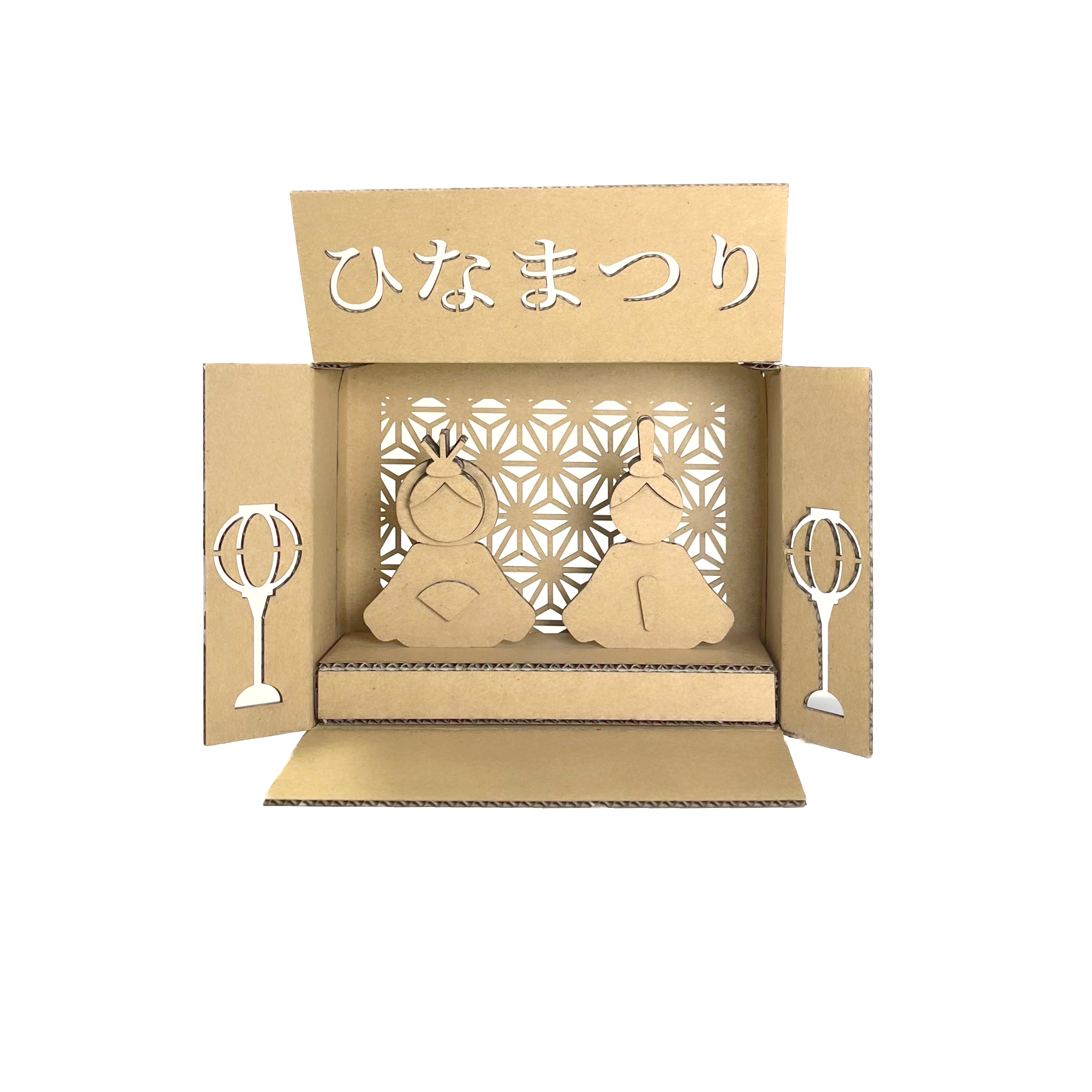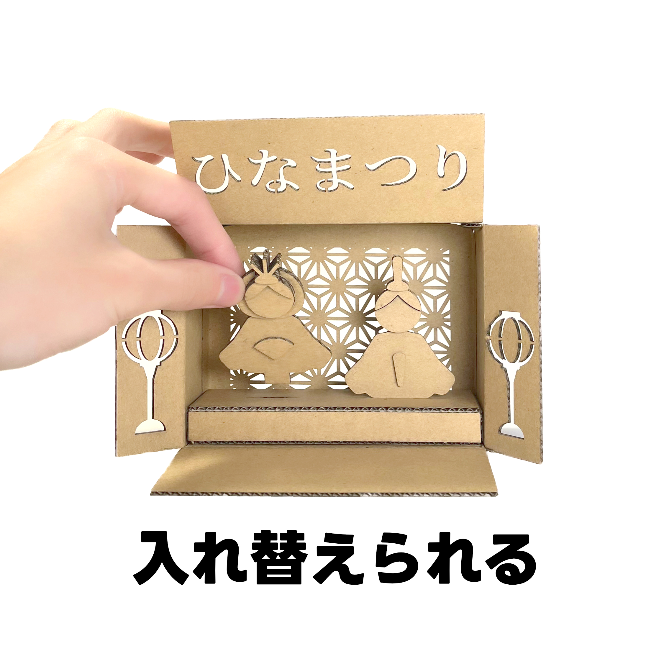 「ひなばこ」は、温かみのあるダンボール素材でつくる、手のひらサイズの可愛らしい雛壇です。箱を横にして蓋を開けると、そこがそのままお雛様を飾る舞台に変わります。コンパクトなサイズ感なので、場所を選ばず、ちょっとしたスペースに春の訪れを添えることができます。